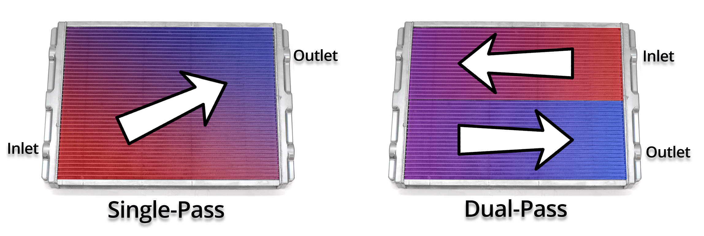 Some vehicles, dependent on model year, may need to utilize a Single-Pass or Dual-Pass configuration of the 034Motorsport Heat Exchanger. The 034Motorsport Heat Exchanger utilizes configurable coolant paths that can be set up to accommodate vehicles with a single-pass or dual-pass configuration with no additional parts.