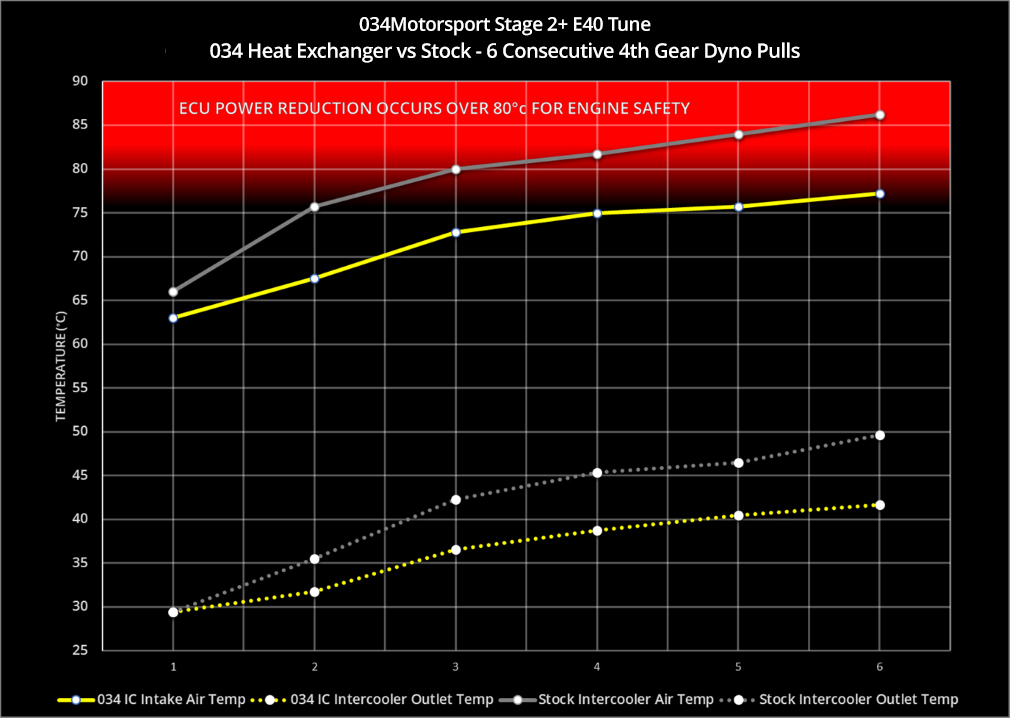 The dyno graph below shows the power output of the 3.0TFSI supercharged engine with the stock heat exchanger vs. the 034Motorsport Supercharger Heat Exchanger. The ECU reduces power when the intake air temperature exceeds 80C. Over successive pulls, the stock heat exchanger is unable to cool the intake charge below 80C after the first couple of pulls, and the ECU intervenes at lower and lower engine RPM as the system becomes heat saturated. The 034Motorsport heat exchanger is able to cool the intake charge below 80C for all 6 consecutive dyno pulls without the ECU intervening to protect the engine, giving consistent power delivery through to redline.