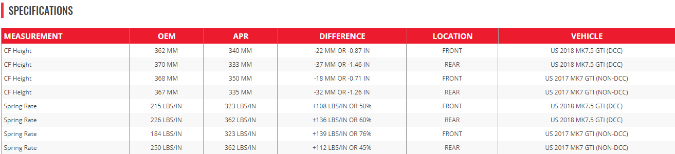 These springs were designed in house and manufactured in the USA using a premium high tensile chrome silicon steel for excellent resilience against sagging and failure for years to come. Each spring comes powder coated in our signature red color, further protecting the spring from the elements. The front and rear springs are a dual rate spring that will operate as a single rate, linear spring, under normal loaded driving situations. All center of wheel to fender (CF) measurements were recorded on our in-house US Spec 2017 MK7 GTI (Non-DCC) and US Spec 2018 MK7.5 GTI (DCC) test vehicles and may vary slightly from vehicle to vehicle. Lastly, while this system was designed specifically for the MK7 / MK7.5 GTI, it will fit other similar platform vehicles.